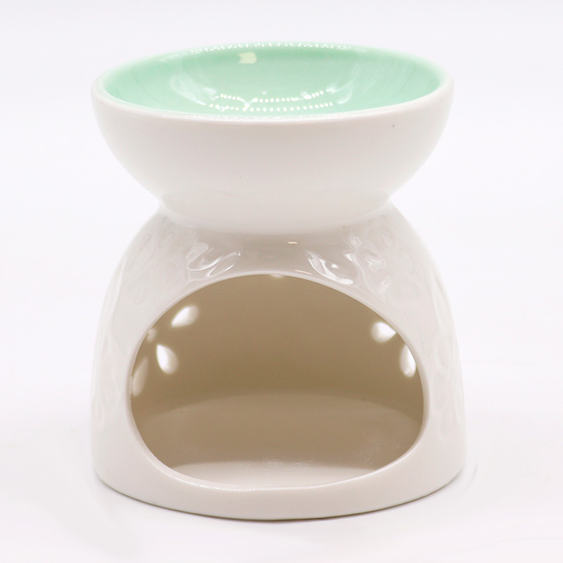 Smuk feminin keramik-lampe med blomsterdekorationer og skål med blød turkis farvning. Aroma-lampen måler ca. 9,5 cm i højden og har en diameter på ca. 9,5 cm Funktionen er simpel: Sæt et tændt fyrfadslys ind i aromalampen, fyld din foretrukne olieblanding i skålen på toppen og nyd hyggen, mens duften spreder sig.