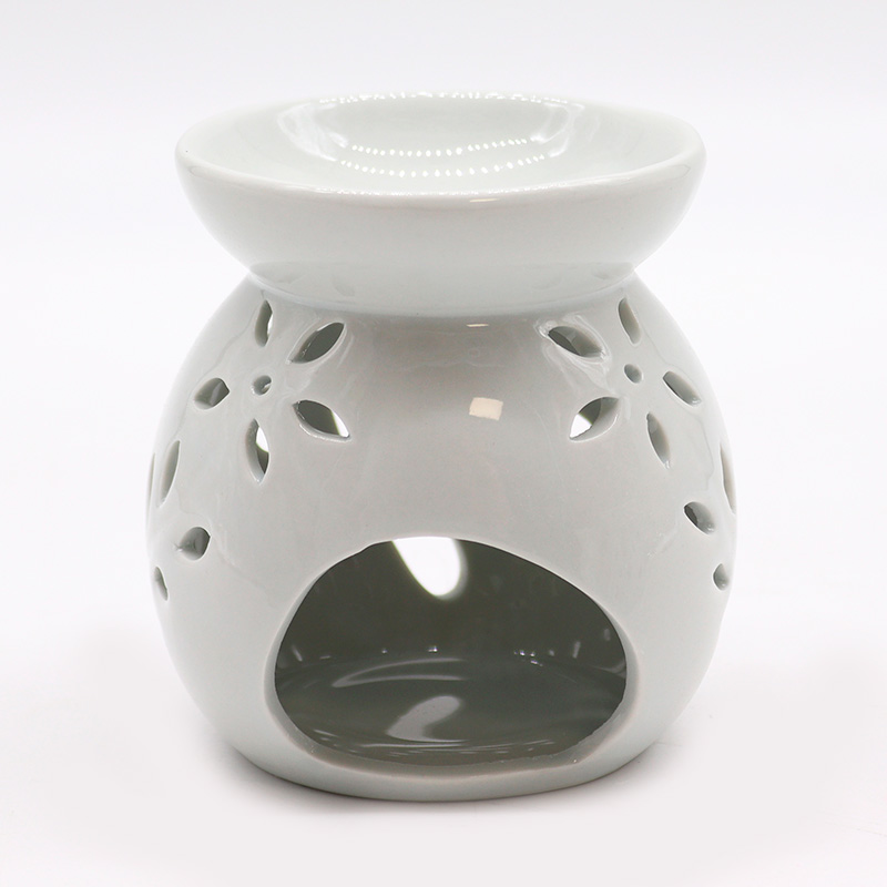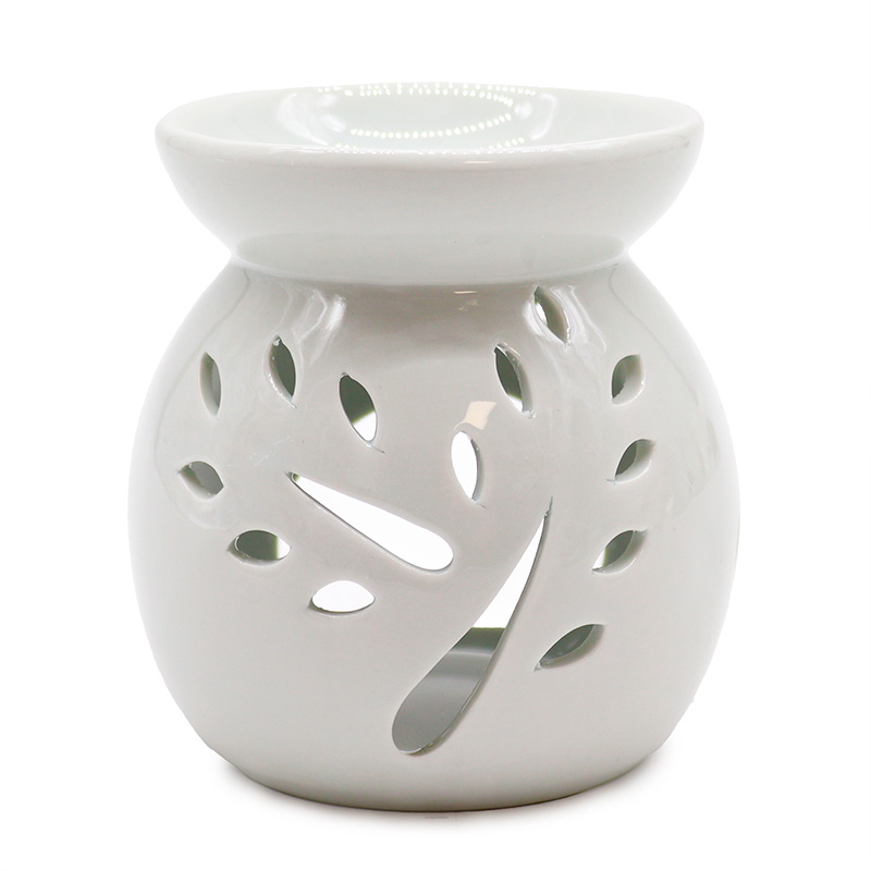 Aromalampe i hvid keramik med udskåret træ-motiv. Lampen fås i to størrelser: Den lille model har en højde på ca. 9,2 cm og en diameter på ca. 8 cm. Den store model måler ca. 9,8 cm x Ø 10 cm. Funktionen er simpel: Sæt et tændt fyrfadslys ind i aromalampen, fyld din foretrukne olieblanding i skålen på toppen og nyd hyggen, mens duften spreder sig.