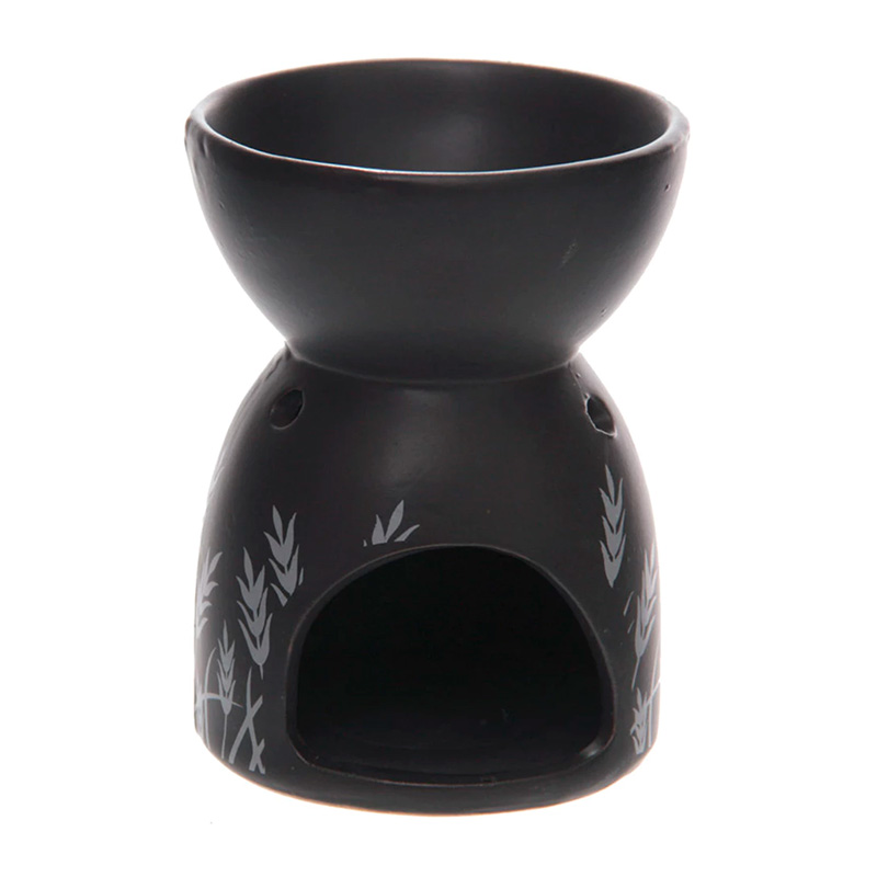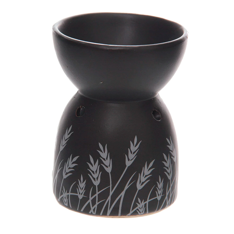Matsort aromalampe med enkelt aks-motiv. Bemærk: Ekstra stor og rummelig skål . Totalmål ca: 11,5 cm x Ø 9 cm. Funktionen er simpel: Sæt et tændt fyrfadslys ind i aromalampen, fyld din foretrukne olieblanding i skålen på toppen og nyd hyggen, mens duften spreder sig.