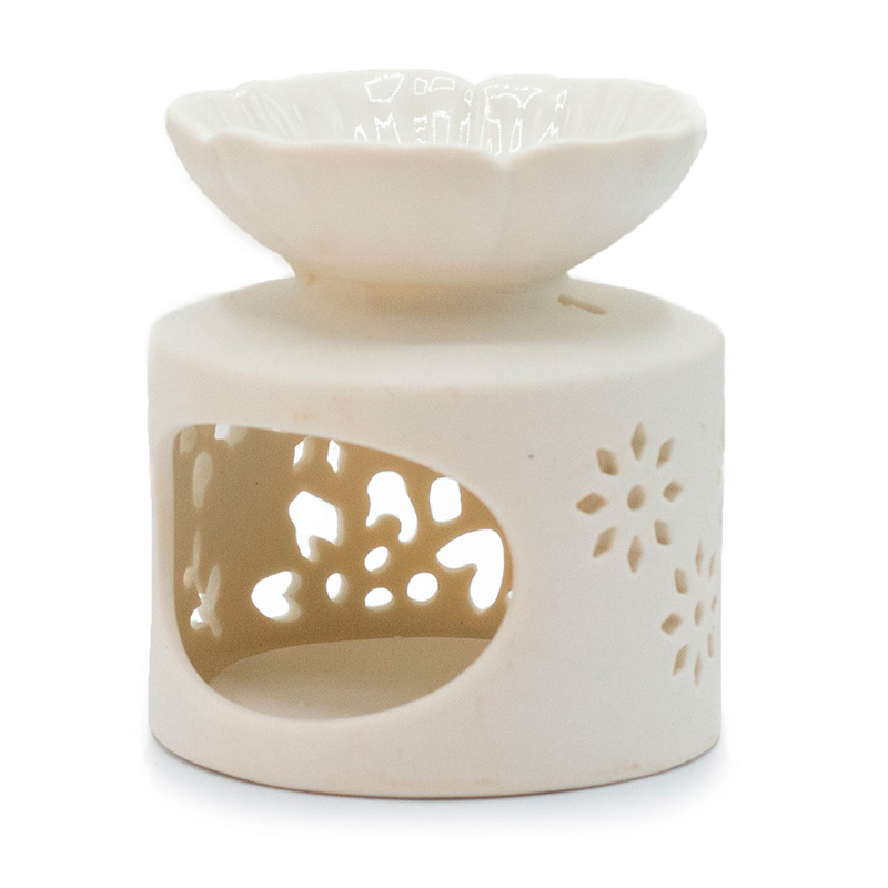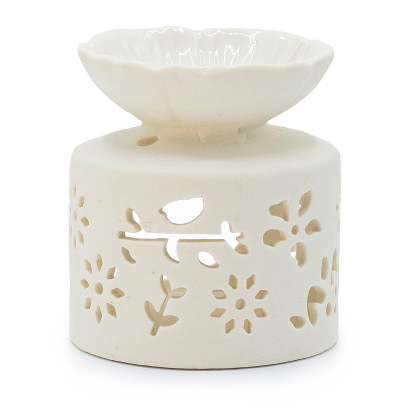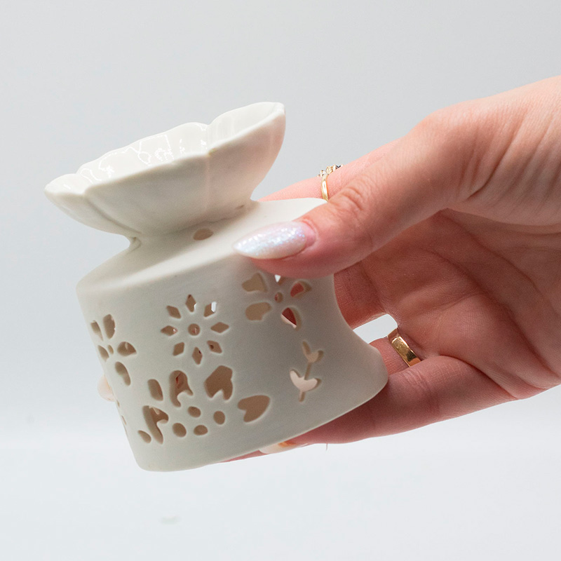 Sød lille aromalampe fra Agnes+Cat i hvid, rå keramik. Selve skålen er glaseret og dekoreret som en blomst. Mål ca: 7,5 cm x Ø 7 cm. Funktionen er simpel: Sæt et tændt fyrfadslys ind i aromalampen, fyld din foretrukne olieblanding i skålen på toppen og nyd hyggen, mens duften spreder sig.